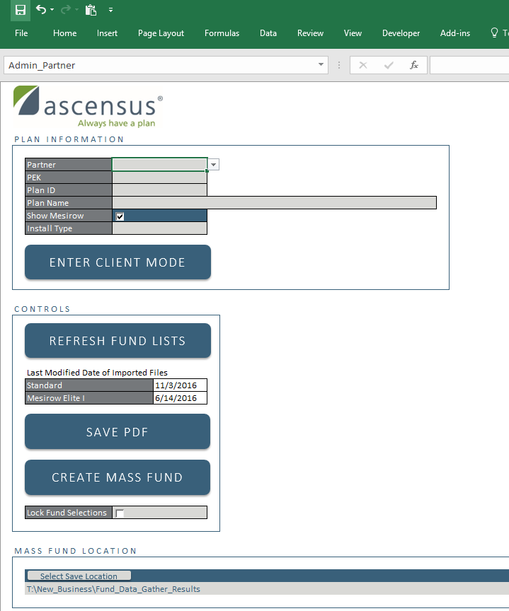 An Excel application was developed with interfaces for browsing to and selecting import file paths, mapping fields, selecting funds, confirming the approval status of funds, and reviewing selected funds. Furthermore, the import process allows the user to enter the parameters of a client so that it will automatically import a custom list of funds available for that client.